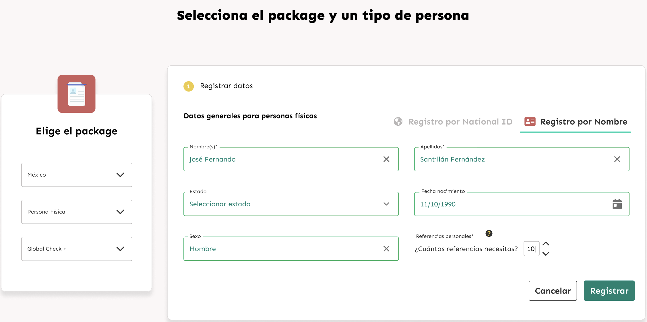 - Los clientes podrán realizar registros candidatos en paquetes que incluyan el proceso Referencias Personales, por National ID o por Nombre.