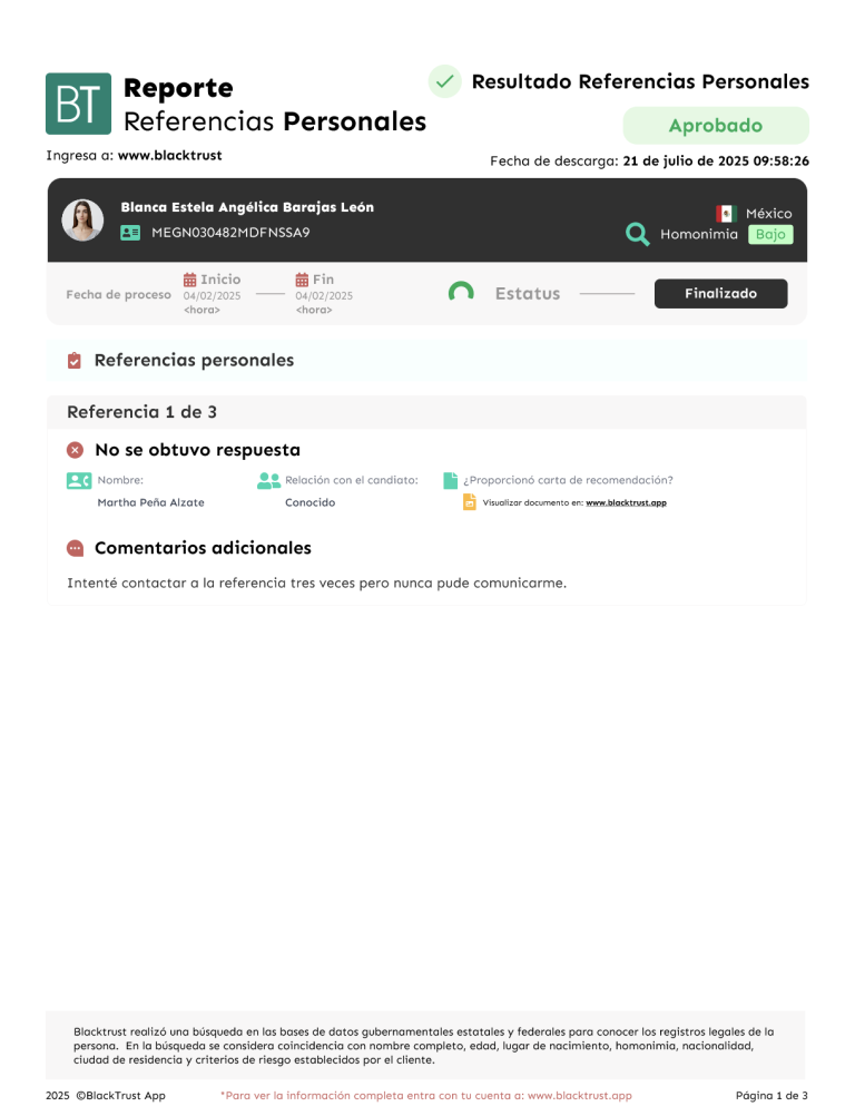 Si se selecciona el botón: “No contestó la referencia”, solo se verá la información proporcionada por el candidato, y el campo de comentarios solo aparecerá si se añade un comentario.