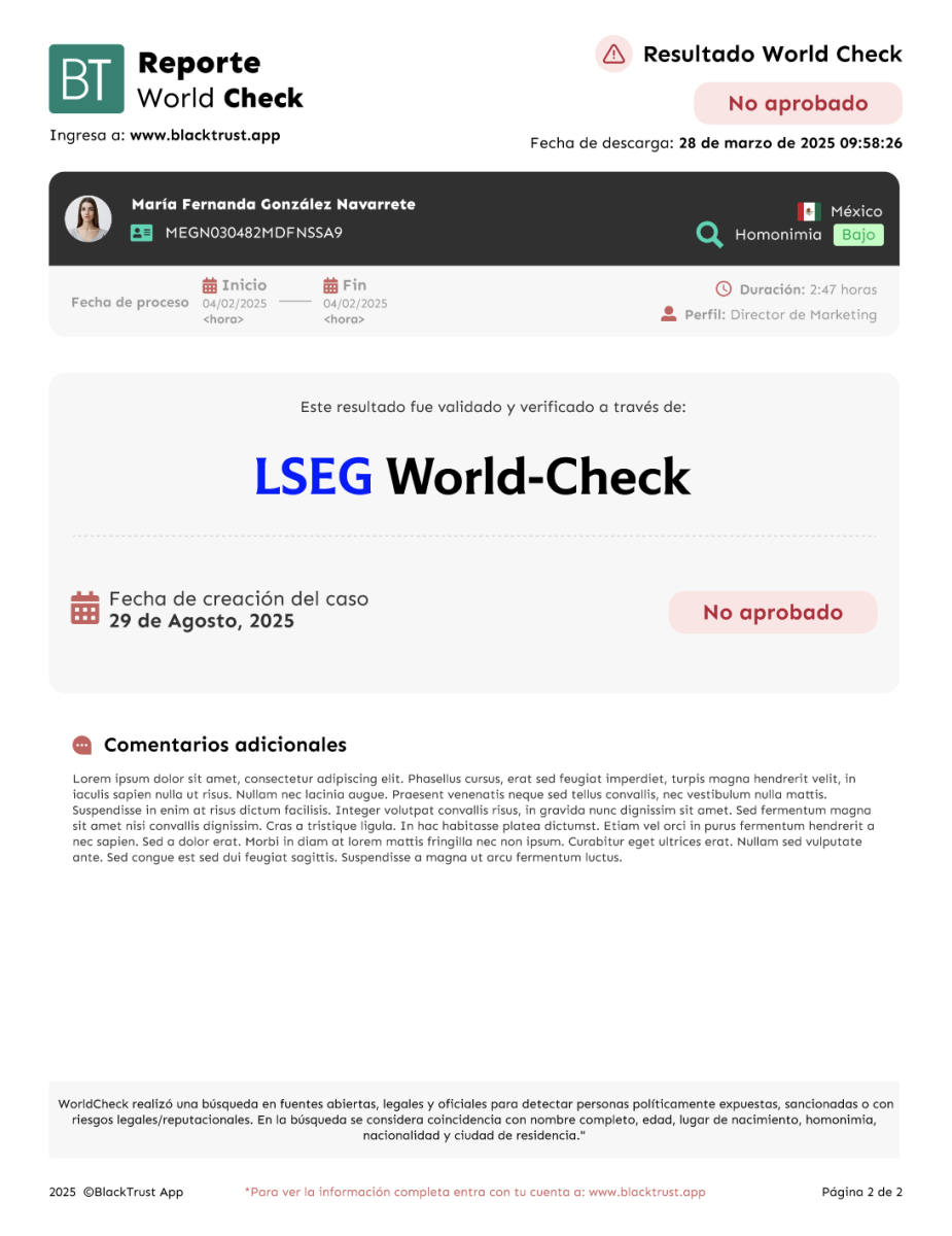 Leyenda: “Este resultado fue validado y verificado a través de LSEG World-Check”