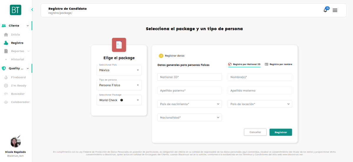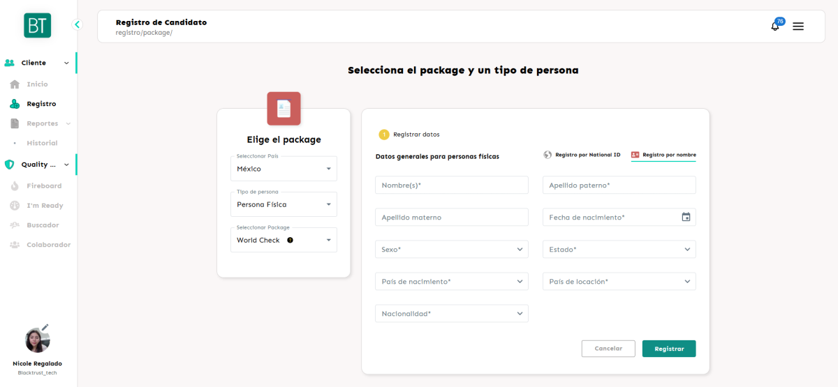Los clientes podrán registrar al candidato dentro de un paquete que incluya este proceso, completando los siguientes datos según el tipo de registro: